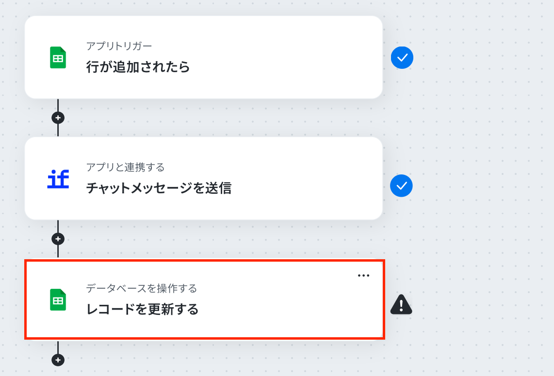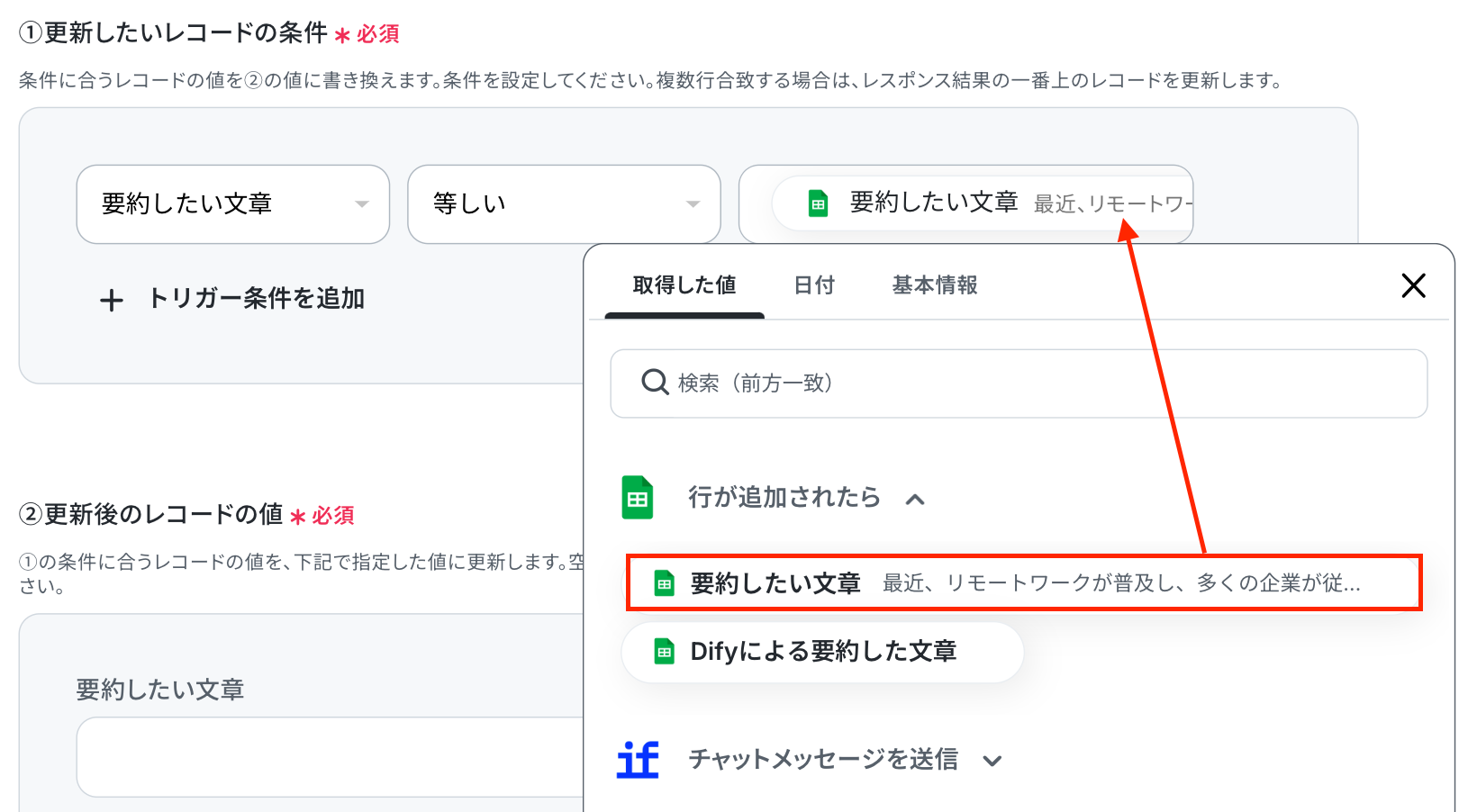 「更新後のレコードの値」は、入力欄をクリックして表示されるアウトプットから選択してください。 更新したい箇所のみ設定します。