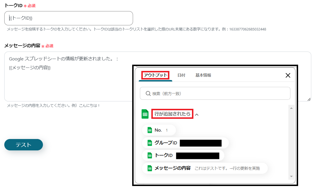 3.トークID、メッセージの内容を設定し、テストを行います。