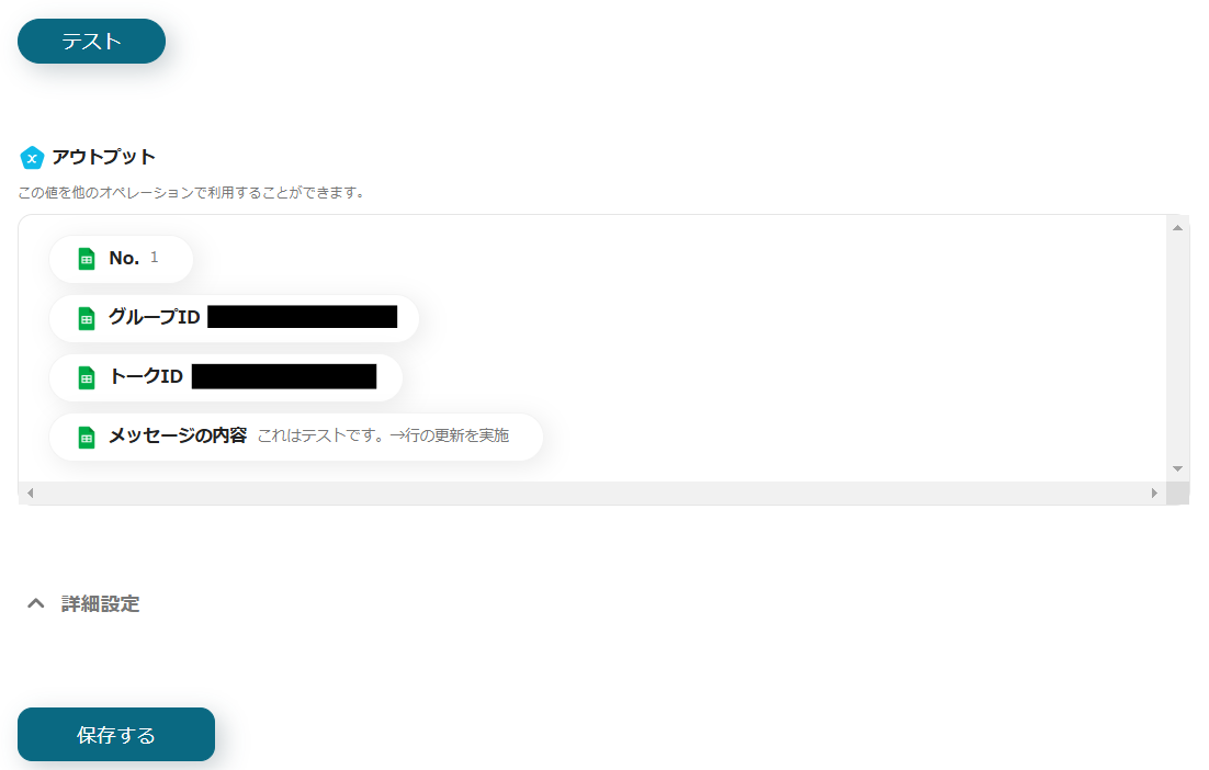 5.テストを行い、成功したらアウトプットにGoogle スプレッドシートから取得した情報が表示されます。