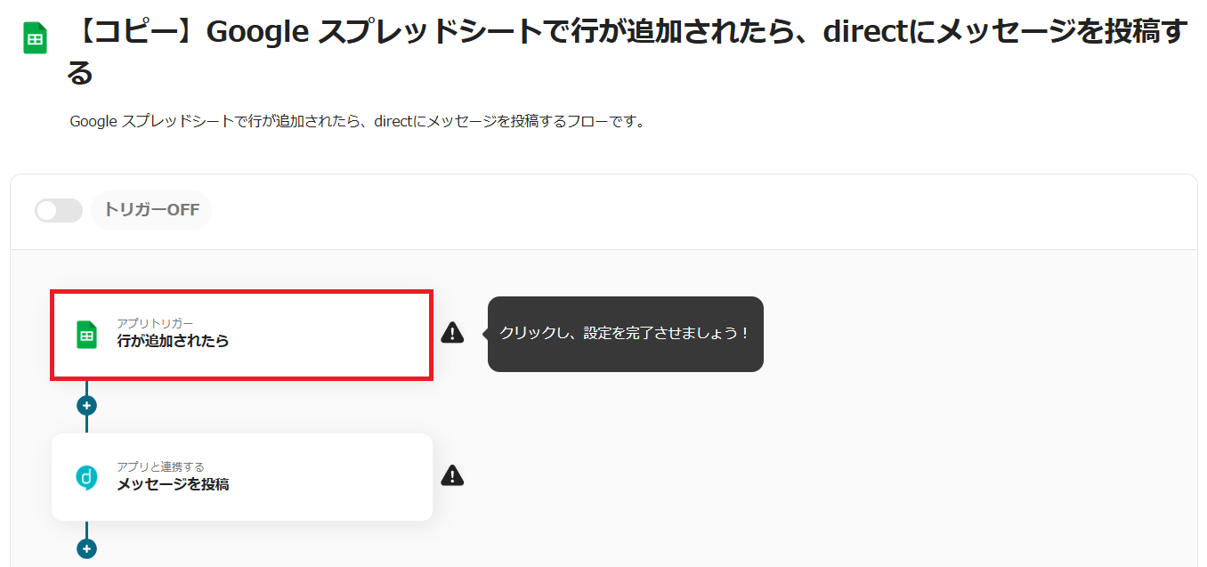 このフローはGoogle スプレッドシートで行が追加されると、トリガーが起動します。