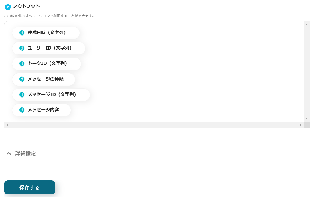 ※トークIDをGoogle スプレッドシートで管理する場合は、枠をクリックして表示されるアウトプットの「行が追加されたら」から選択できます。(値は二重括弧で表示されます)手動で入力する場合は、下記画像の下でトークIDの取得場所を解説しています。