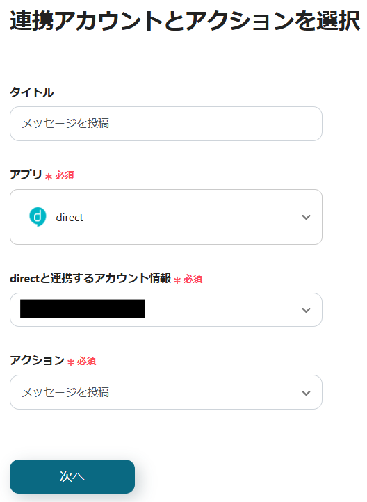 2.directと連携するアカウントを確認し、「次へ」をクリックします。