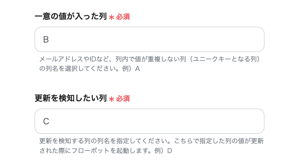 次に「一意の値が入った列」 と「更新を検知したい列」 を入力します。