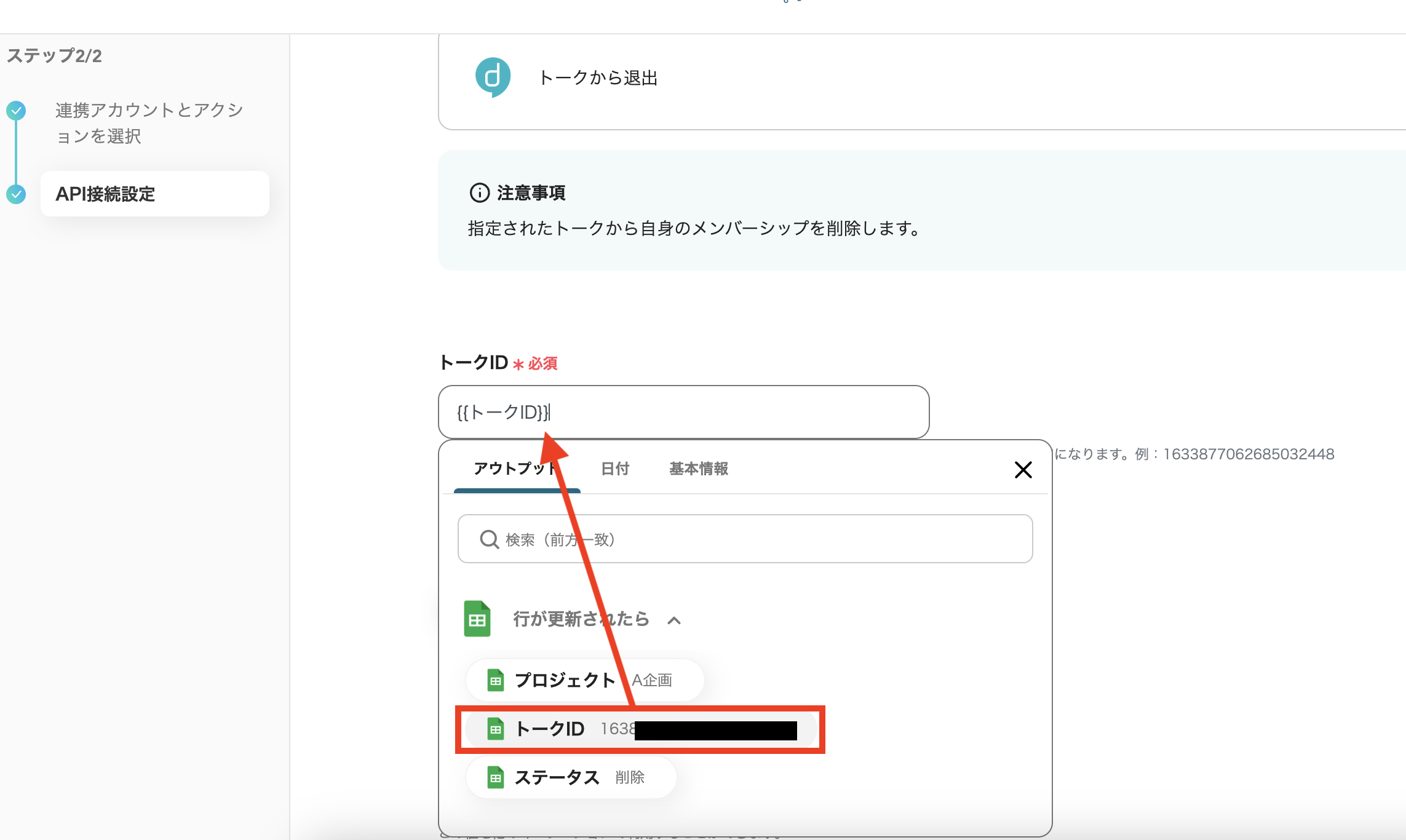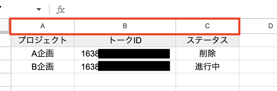 まずはトークIDの記載です。 欄をクリックすると、下記のようにGoogle スプレッドシート上に該当する項目が出てくるので、「トークID」 に該当するものをクリックします。
