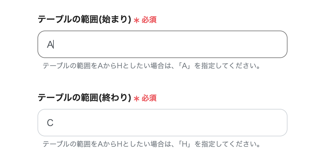 次に、「シートの範囲」 を入力します。 今回は下記画像のようにA〜C列に記載があるのでそのように入力します。