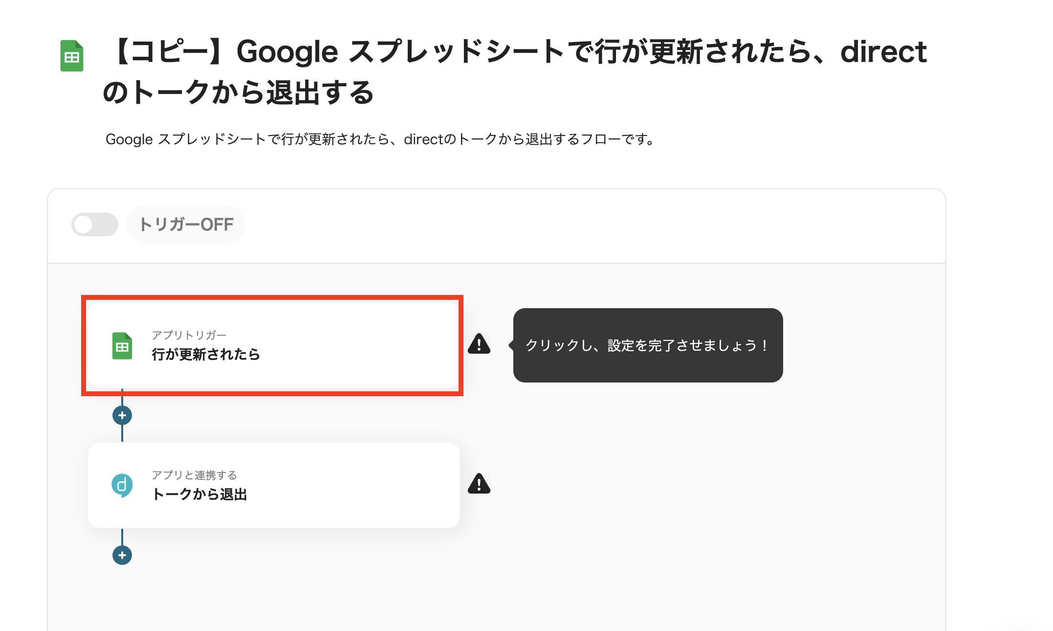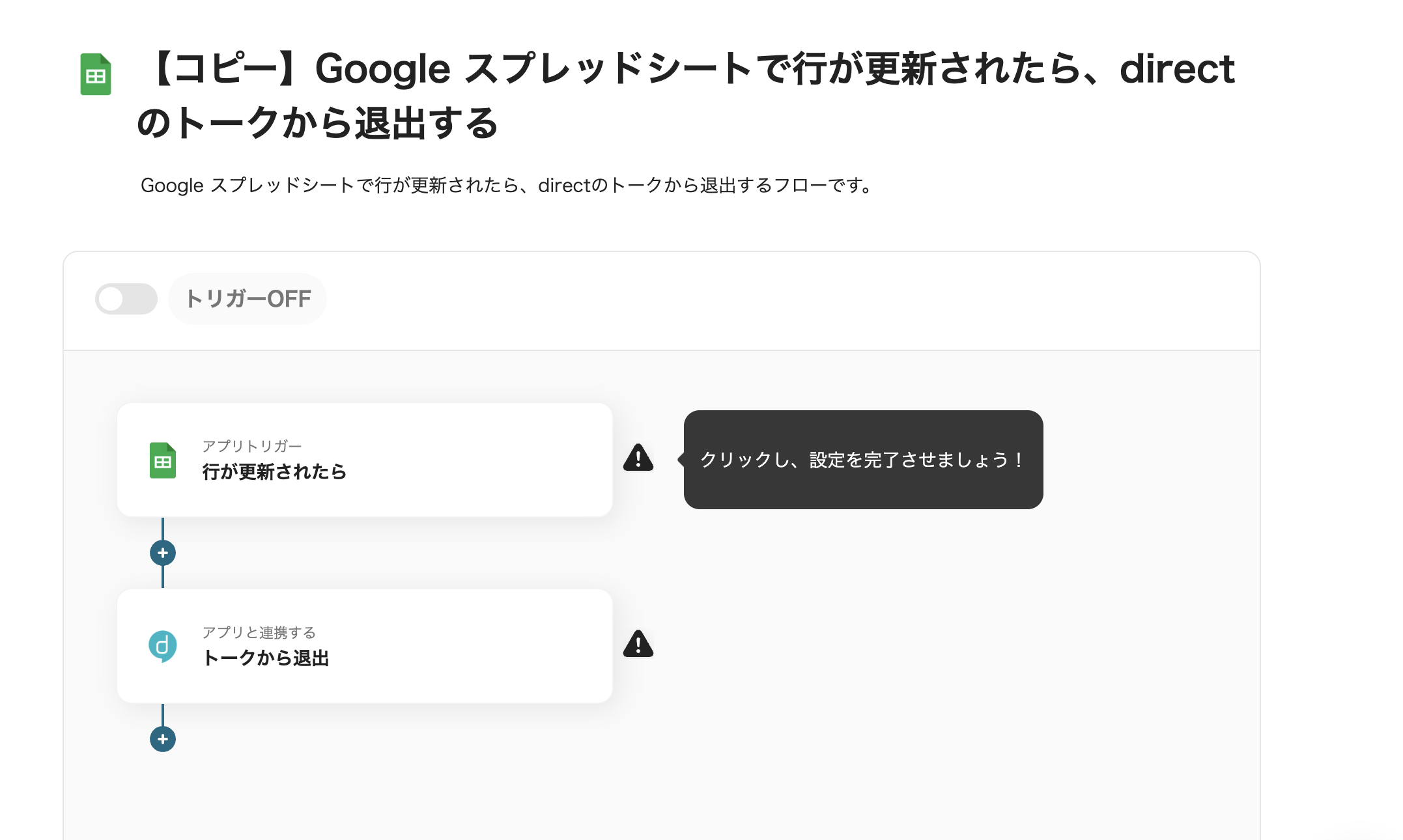 Googleスプレッドシートで従業員データの行が更新されると、その内容をもとにdirect上の該当メンバーを自動的にトークから退出させるフローです。スプレッドシートの変更内容をdirectに反映できるため、メンバー管理を効率化し、不要なトーク参加を防げます 。