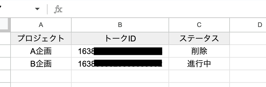 「一意の値が入った列」 は列内で値が重複しない列を入力します。今回はトークIDのB列にします。「更新を検知したい列」 は更新情報を取得したい列を入力します。今回はステータスのC列にします。
