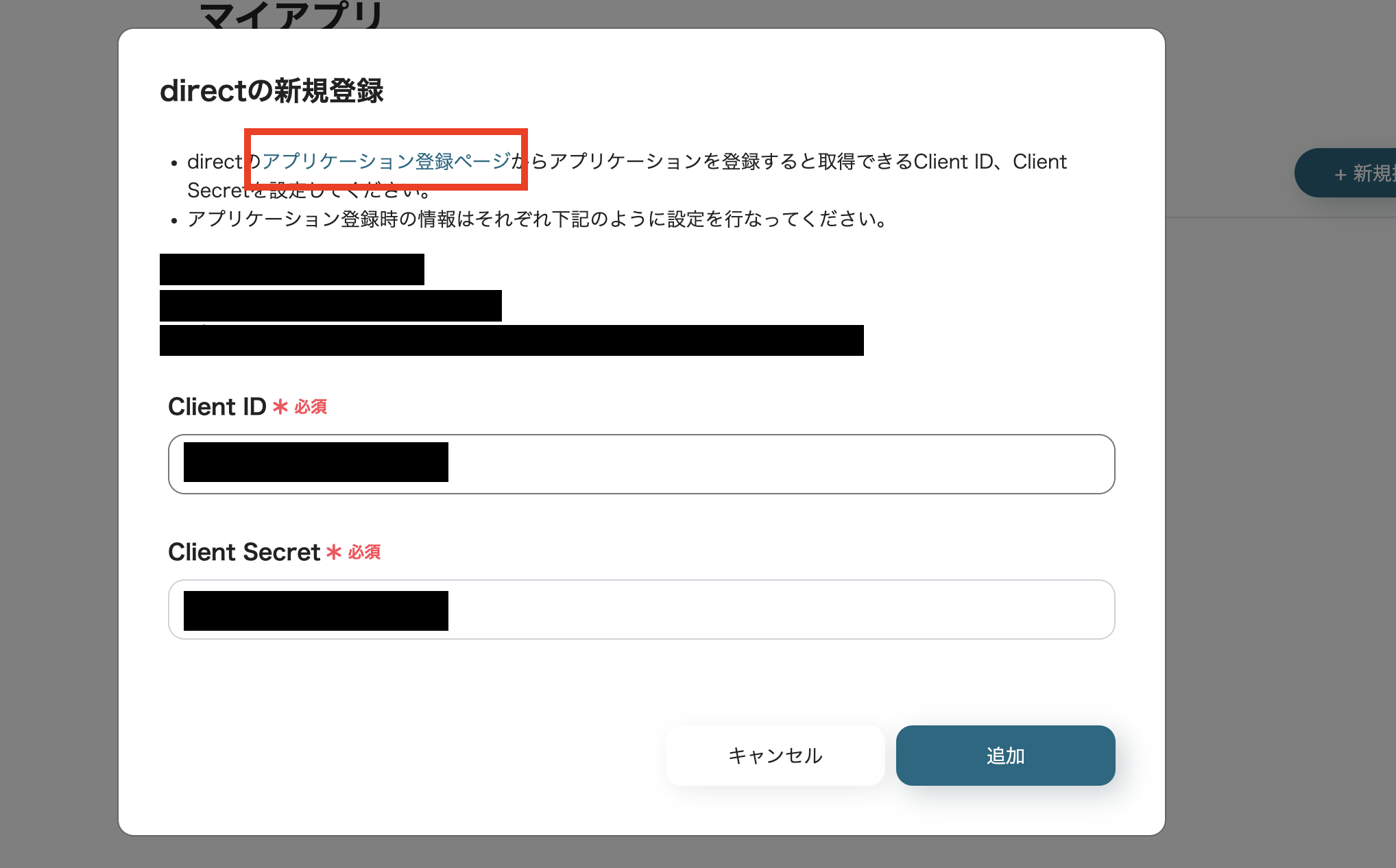 directを登録する際に、下記の画面が表示され、ID入力を求められます。 IDを取得するため、「アプリケーション登録ページ」 という部分をクリックし、directの画面に移動します。