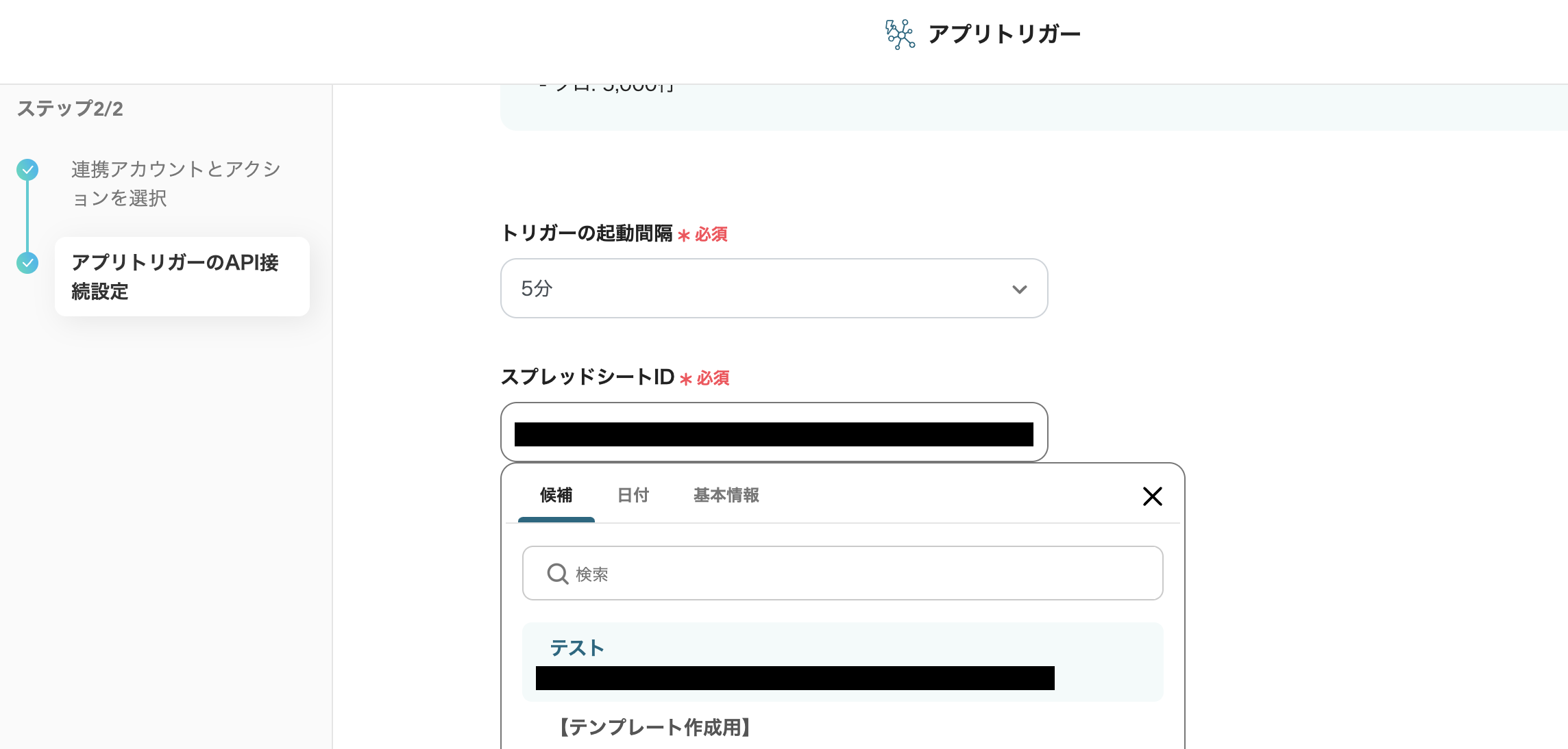 「スプレッドシートID」 はステップ3で準備したシートを選択しましょう。 欄をクリックすると候補が自動で出てくるので該当するものをクリックします。