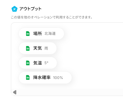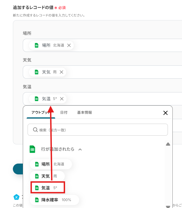 4.「追加するレコードの値」に、先ほど取得したアウトプットを選択します。