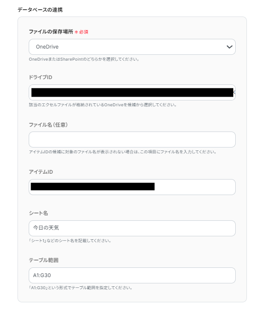 「ファイルの保存場所」はOneDriveかSharePointのどちらかを選択し、その他の項目は注釈を参考に入力します。