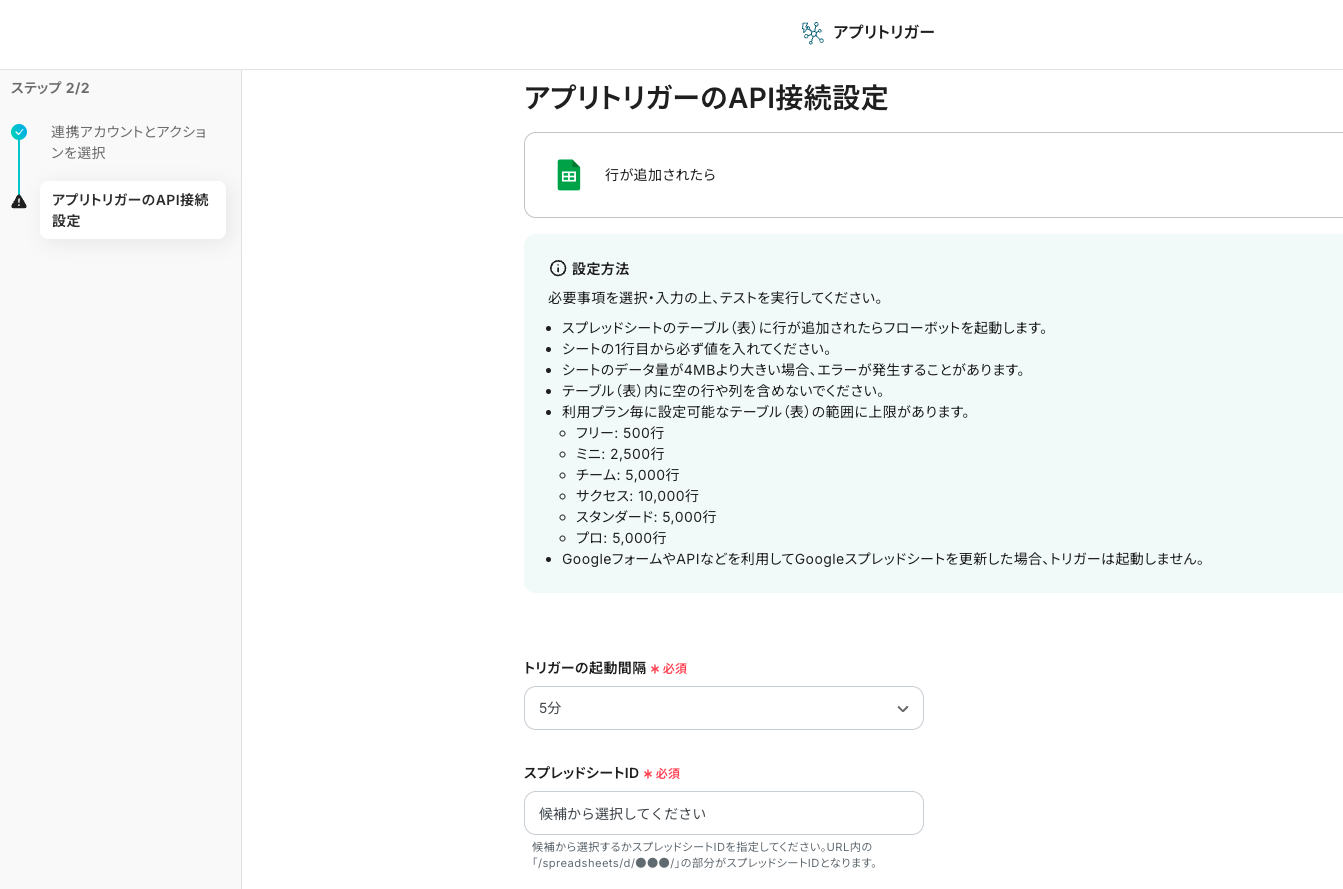 ステップ3:Google スプレッドシートのアプリトリガー(行が追加されたら) テンプレートの1つ目の工程をクリックし、フローボットのトリガー(起点)を設定します。 この工程では、フローの起動間隔と対象のGoogle スプレッドシートの情報を設定していきます。