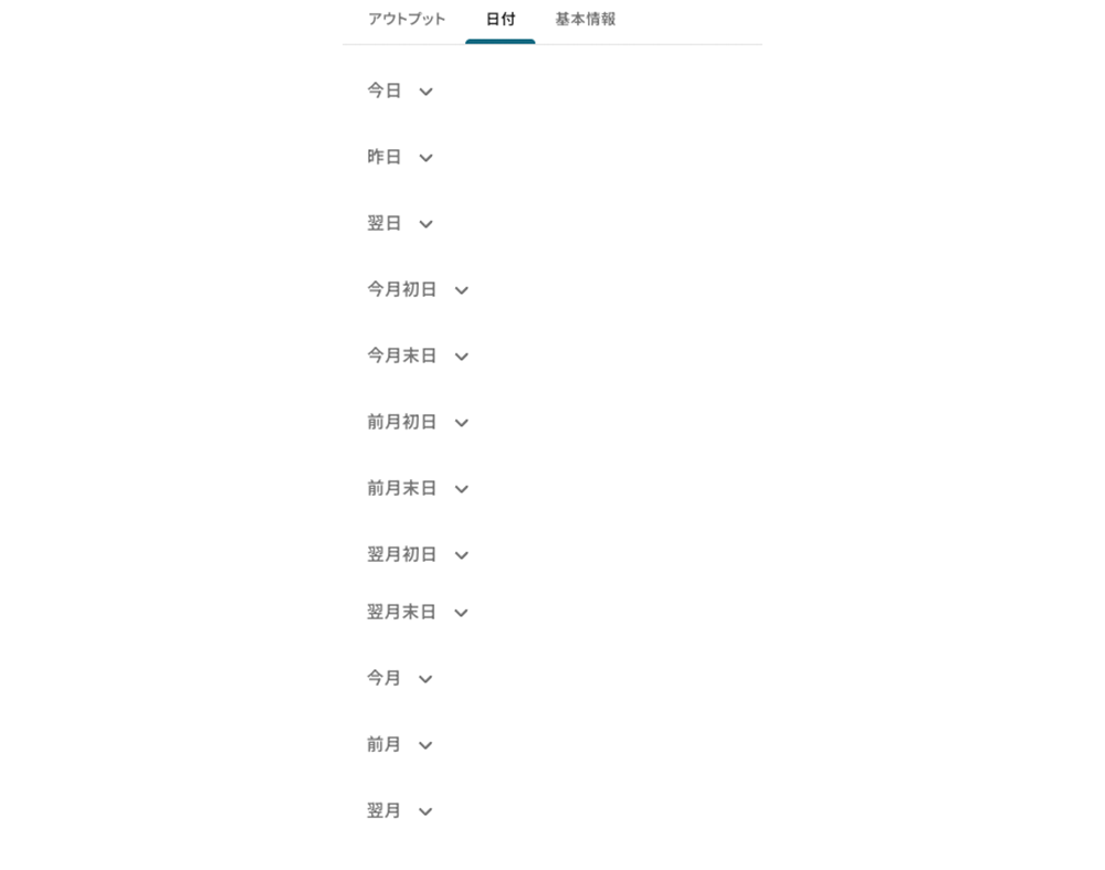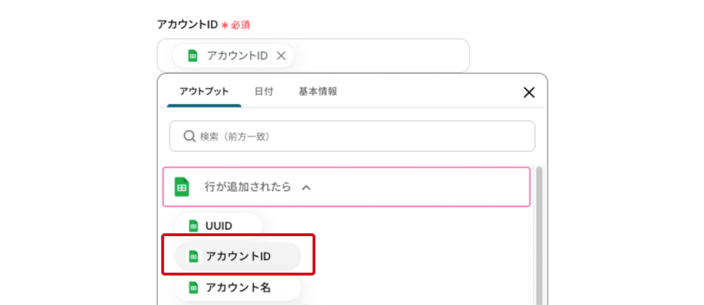 事前設定ではGoogle スプレッドシートからアカウントIDを取得できるようにアウトプット(取得した値)が埋め込まれています。このアウトプット(取得した値)は編集欄をクリックすると表示されるアウトプット(取得した値)の項目から選択できます。