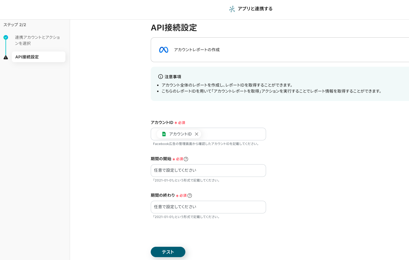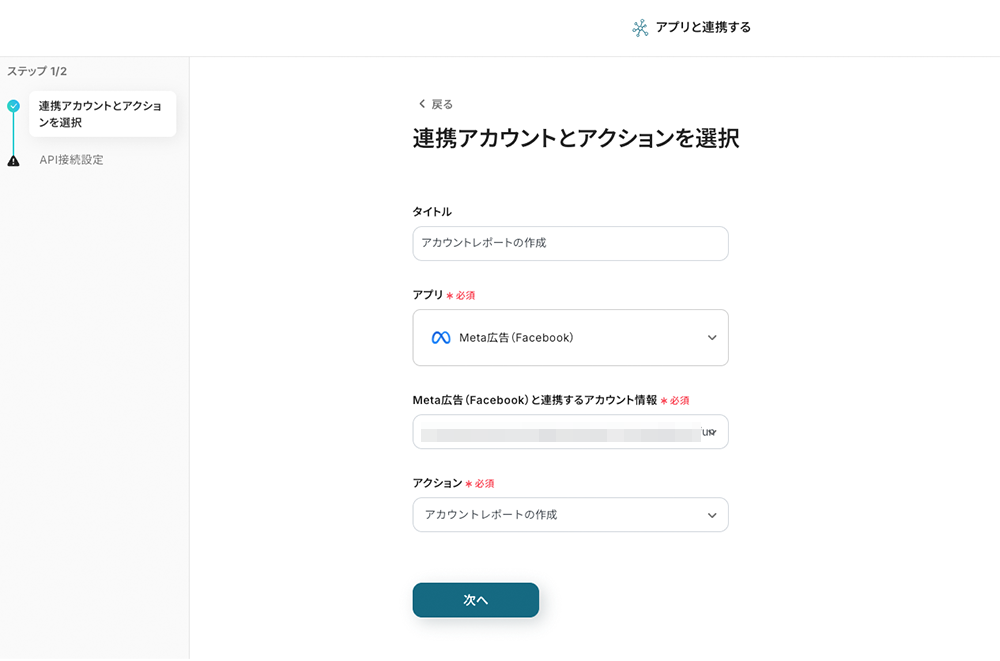 ステップ4:Meta広告(Facebook)のアクションを設定(アカウントレポートの作成) テンプレートの2つ目の工程をクリックします。この工程では、Meta広告(Facebook)のレポートを取得する期間などを設定します。