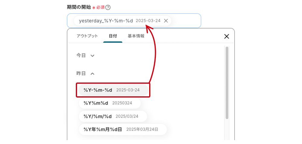今回は前日1日間のレポートに設定しました。両方の項目に「昨日」の引用コードを入力でOKです。