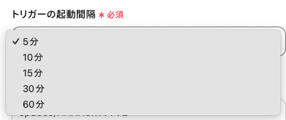 プルダウンを開くと候補から選択できます。 トリガーの起動タイミングは、5分、10分、15分、30分、60分のいずれかで設定できます。ご利用プラン によって、設定できるトリガーの最短間隔が違いますが、基本的にはそのプランの最短の起動間隔にしておきましょう。
