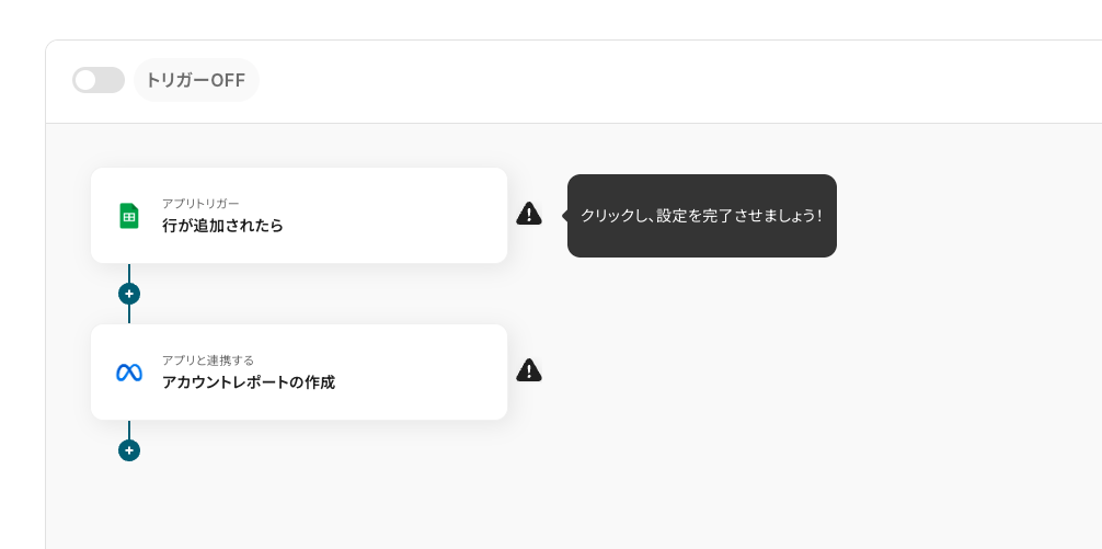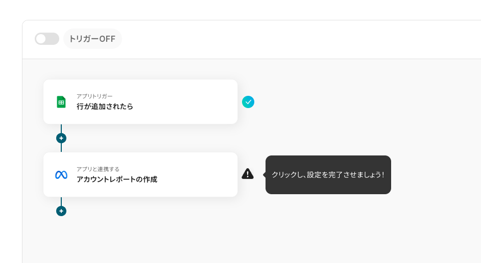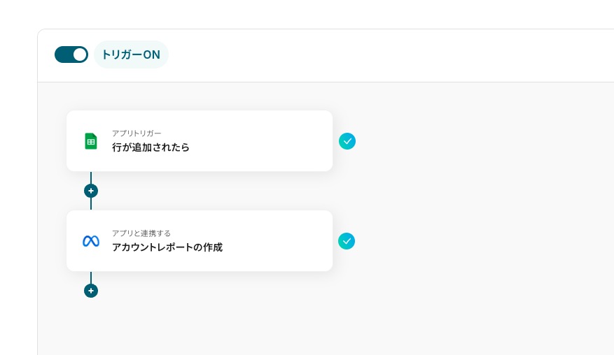 はじめに、Google スプレッドシートとMeta広告(Facebook)をYoomと連携します。 次に、トリガーでGoogle スプレッドシートを選択し、「行が追加されたら」というアクションを設定します。 続いて、オペレーションでMeta広告(Facebook)を選択し、「アカウントレポートの作成」アクションを設定します。 さらに、オペレーションでMeta広告(Facebook)の「アカウントレポートを取得」アクションを設定し、作成されたレポートのデータを取得します。 最後に、オペレーションでGoogle スプレッドシートを選択し、「レコードを更新する」アクションを設定し、取得したレポート内容を反映させます。 ※「トリガー」:フロー起動のきっかけとなるアクション、「オペレーション」:トリガー起動後、フロー内で処理を行うアクション