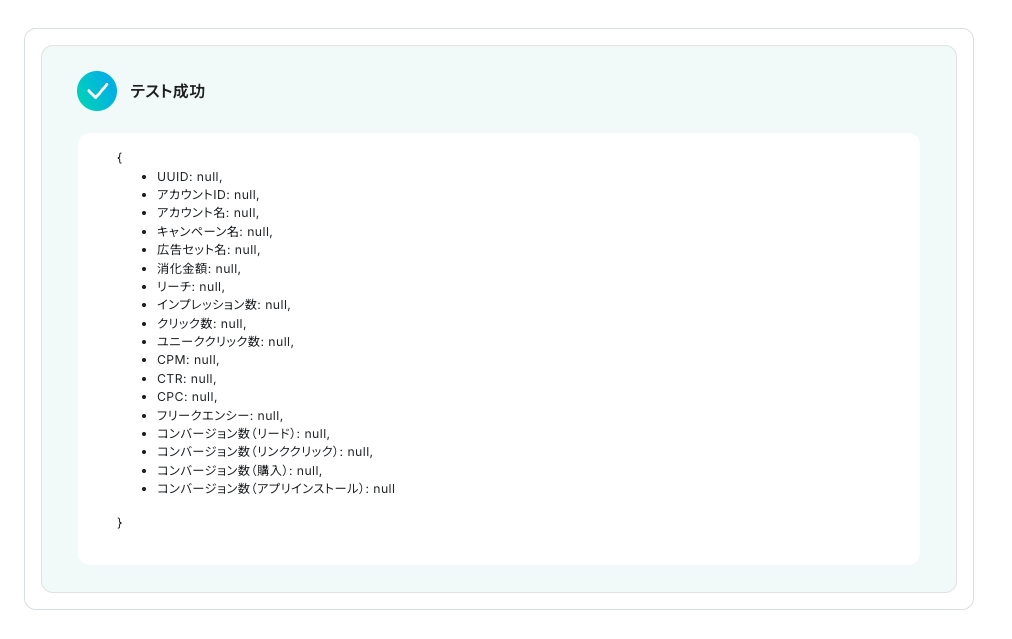 入力が終わったら、下部にあるテストボタンをクリックします。テストに成功すると、Google スプレッドシートの項目が取得できます。