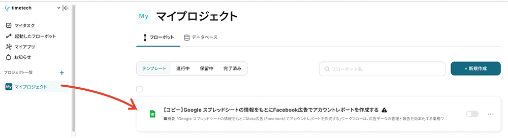 コピーしたテンプレートは、マイプロジェクトに追加されます。マイプロジェクトは左のメニューバーからアクセス可能です。