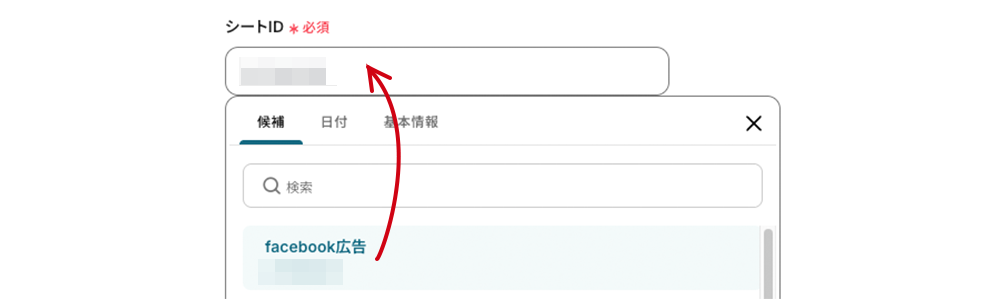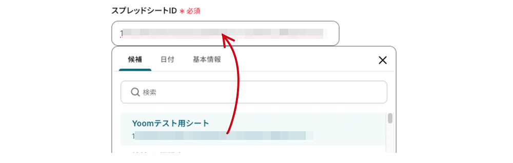 編集欄をクリックすると、プルダウンが表示されスプレッドシートの候補が表示されます。連携するシートを選択すると、編集欄にIDが引用されます。