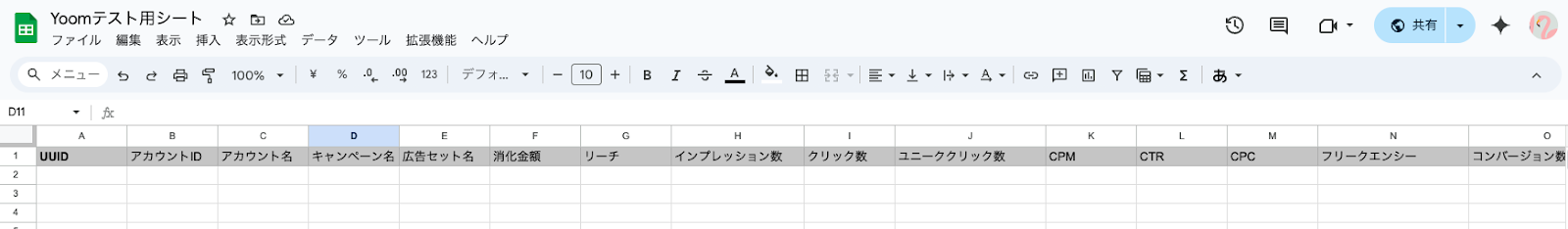 次は表の列を指定する項目です。以下はサンプルのシートです。 1行目に項目を記載しています。項目名はMeta広告(Facebook)で取得できる項目に合わせています。