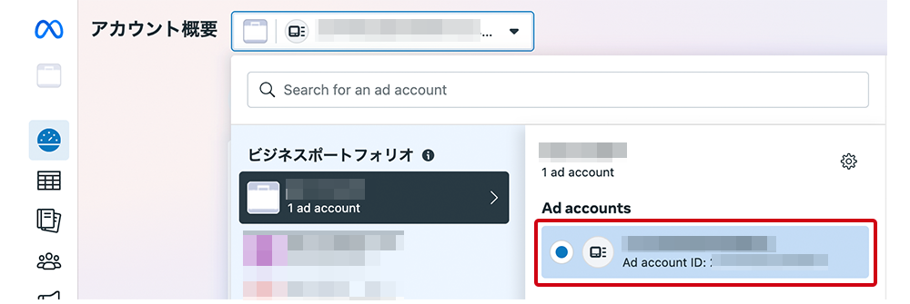 ちなみに、Meta広告(Facebook)のアカウントIDは広告マネージャから取得できます。
