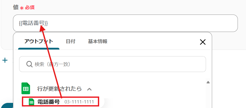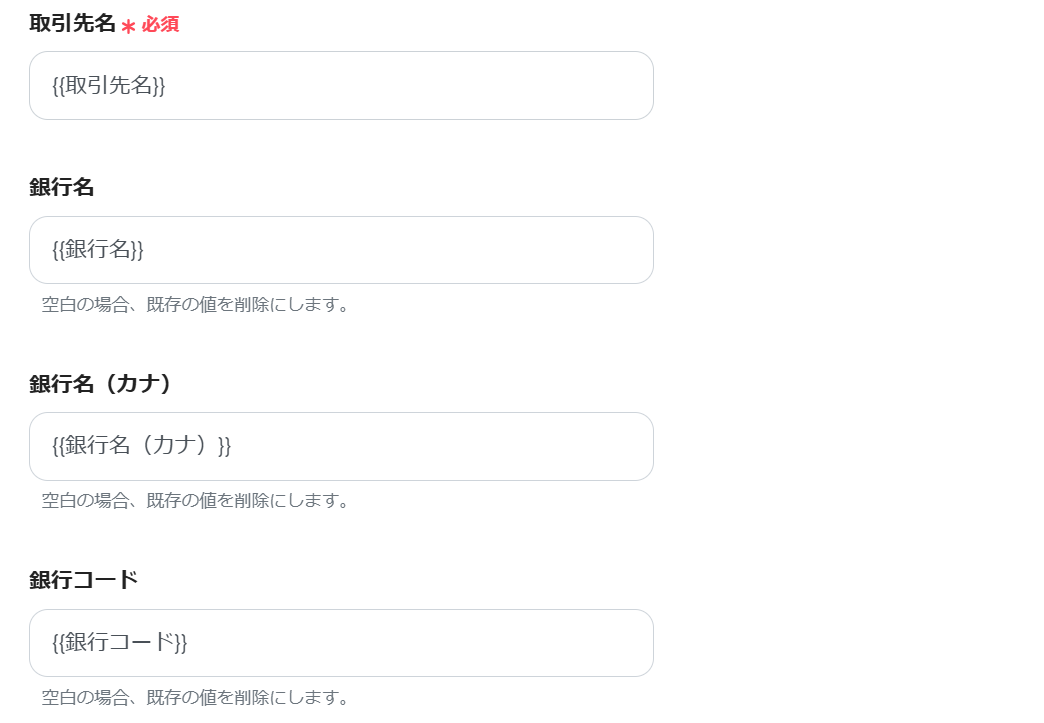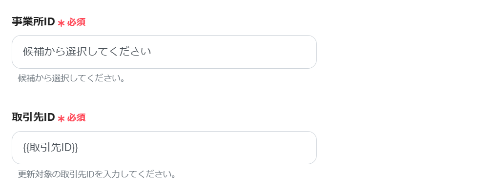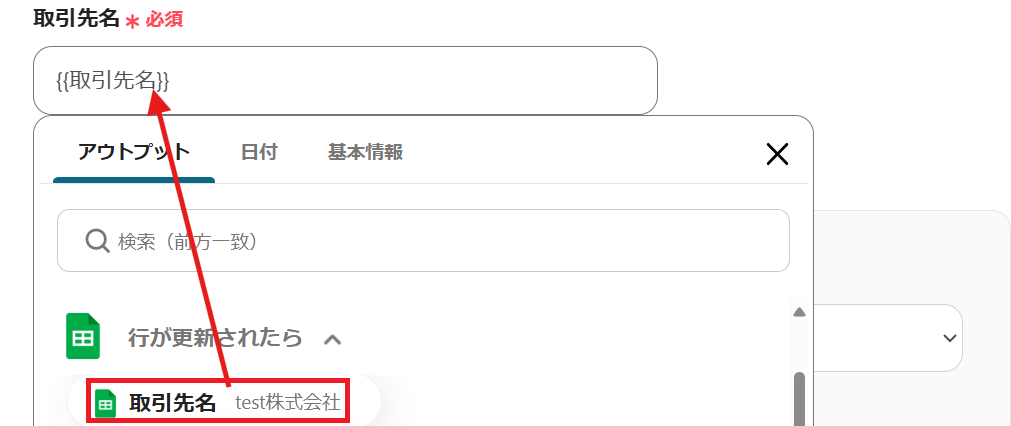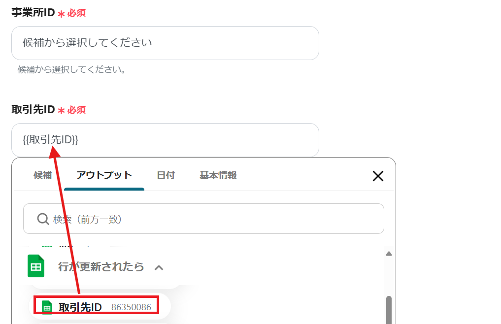 取引先IDと取引先名は、以下のようにアウトプットから選択します。