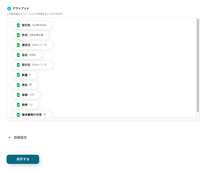 テストに成功すると、freee請求書から取得した情報がアウトプットに表示されます。