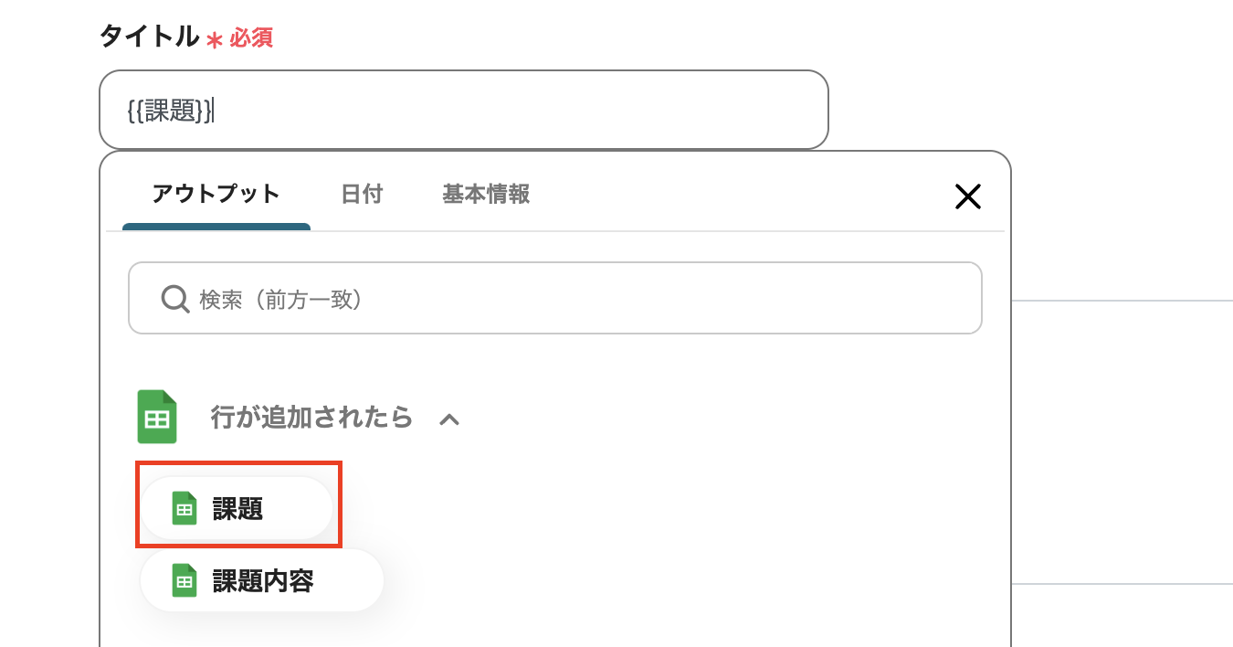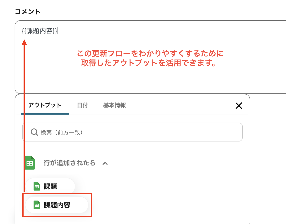以下の画面のように前ステップから取得した情報をアウトプットとして引用できます。