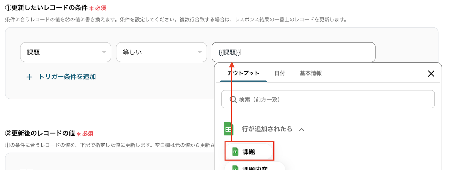 以下は例として、「①更新したいレコードの条件」へ、更新したいレコードに『課題』を指定し、条件を『等しい』、条件と一致する情報を『課題』と設定したものです。