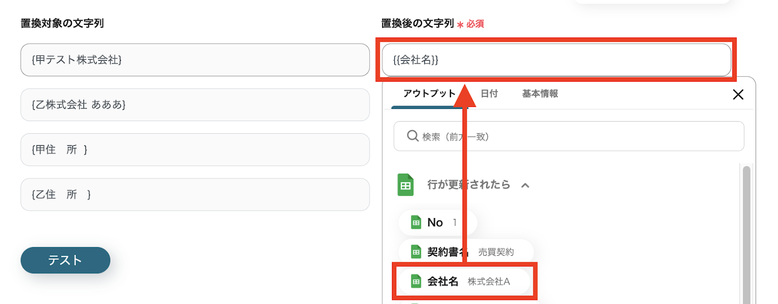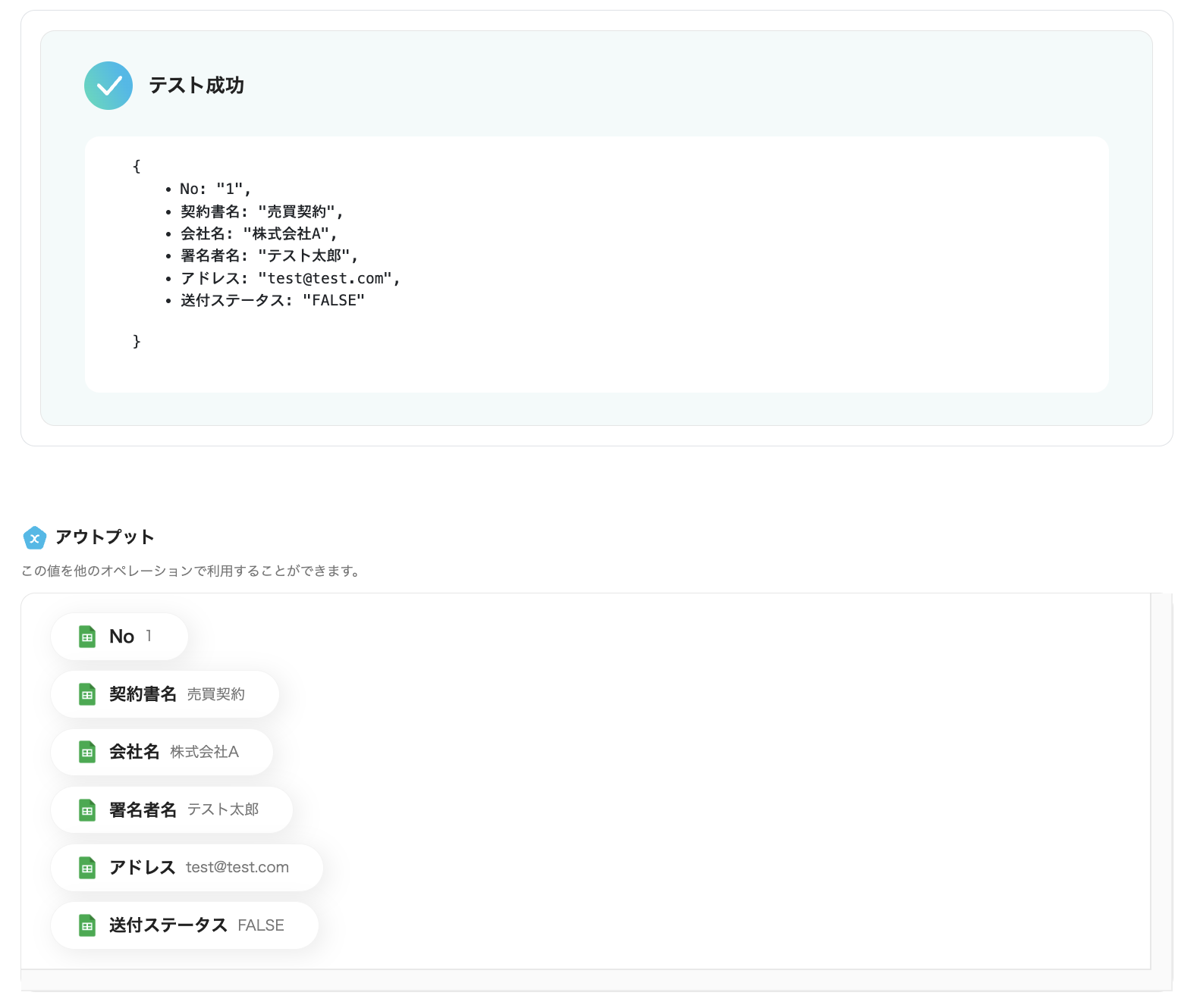 情報を入力後、「テスト」をクリックします。 テストに成功し、アウトプットの値にスプレッドシートの情報が正しく表示されたら「保存する」をクリックします。 これでGoogle スプレッドシートのトリガー設定は完了です。