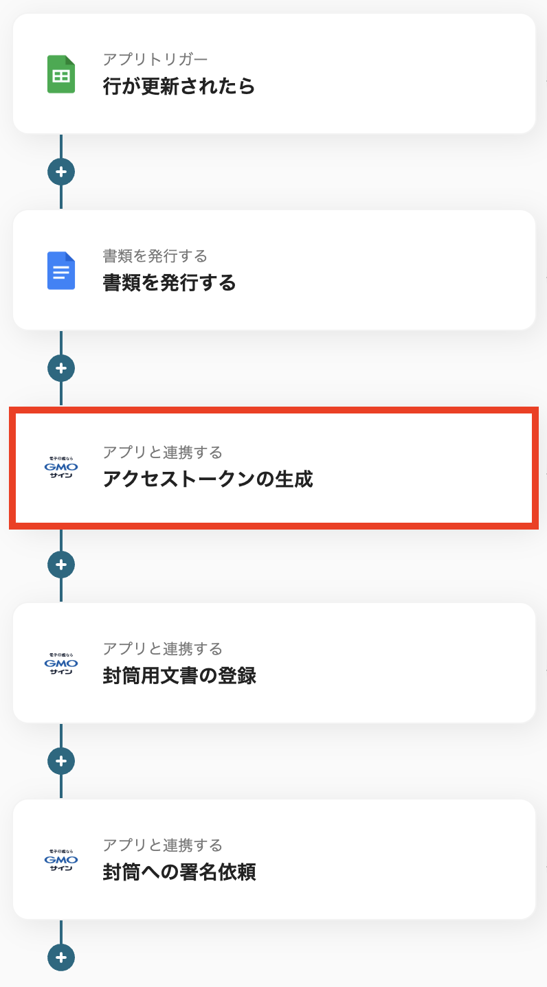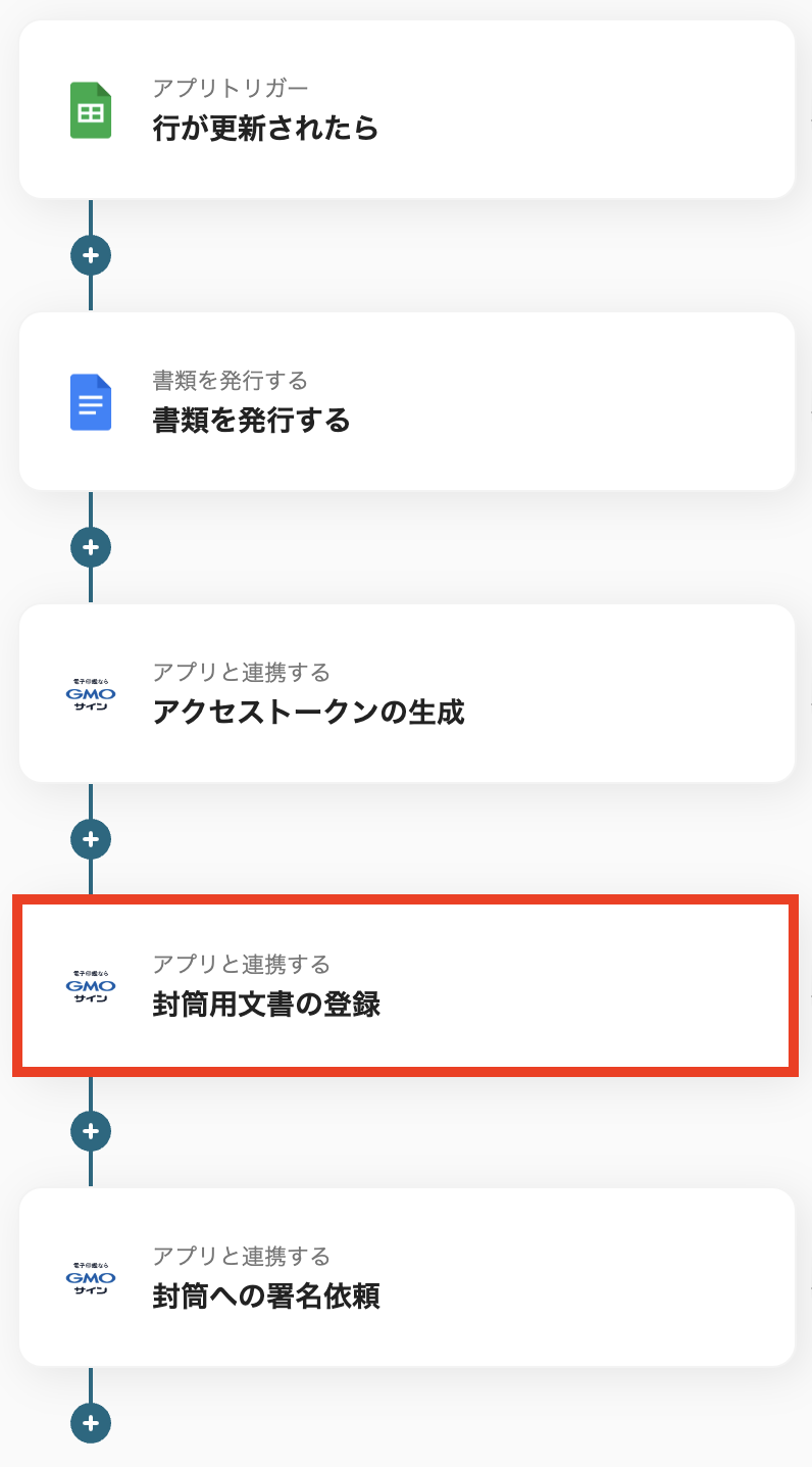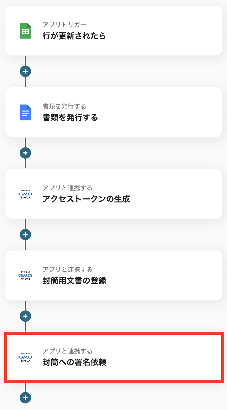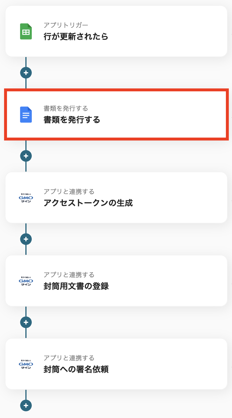 Googleドキュメントの「書類を発行する」アクションでは、あらかじめ用意した雛形を使用することで、任意のレイアウトで契約書を作成できます。 GMOサインの「封筒用文書の登録」では、書類名などに固定のテキストを設定したり、スプレッドシートから取得した情報を動的な値として設定することが可能です。 GMOサインの「封筒への署名依頼」では、署名者の氏名やメールアドレスなどをスプレッドシートのデータと連携させ、動的に設定することができます。 ■注意事項