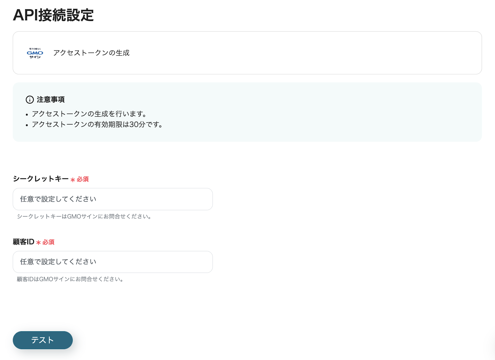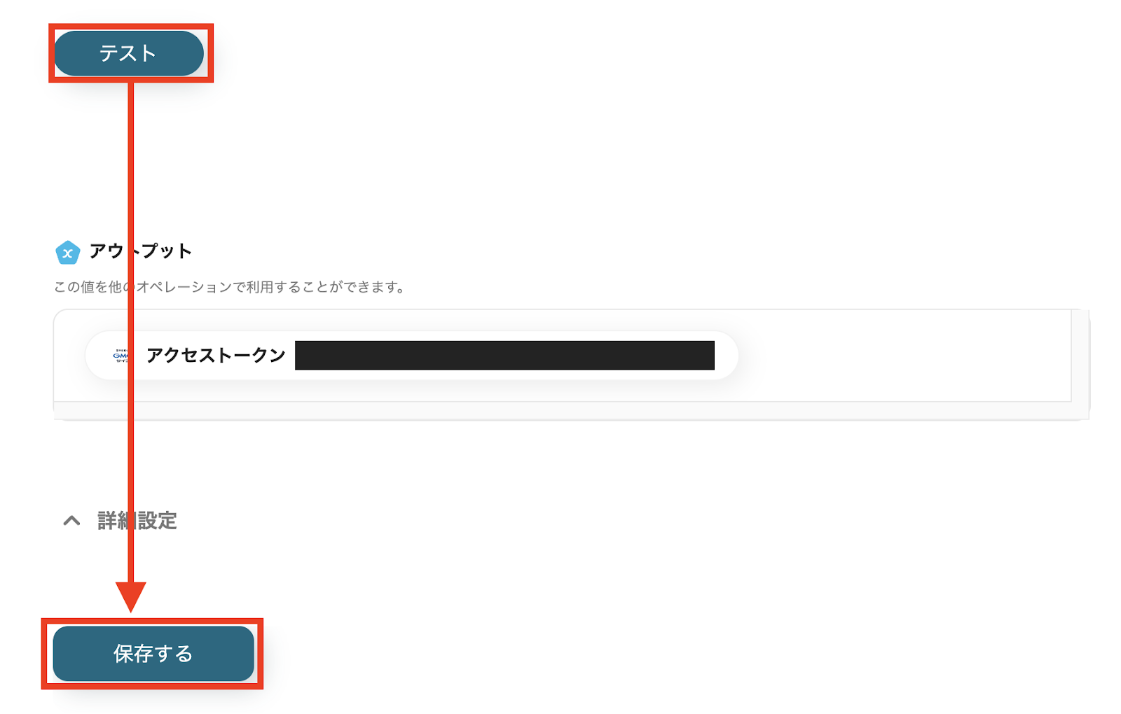 入力が完了したら「テスト」をクリックします。 アウトプットでアクセストークンが問題なく取得できていることを確認し、「保存する」をクリックしてください。 これで、GMOサインのアクセストークンの生成は完了です。 ※生成したアクセストークンの有効期限は30分です。