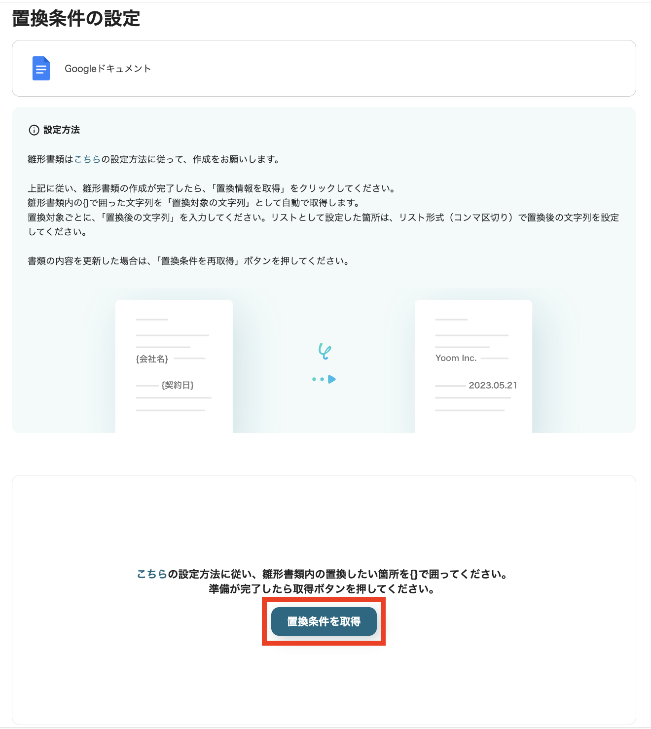 「置換条件の設定」ページに遷移します。 「置換条件を取得」をクリックしてください。
