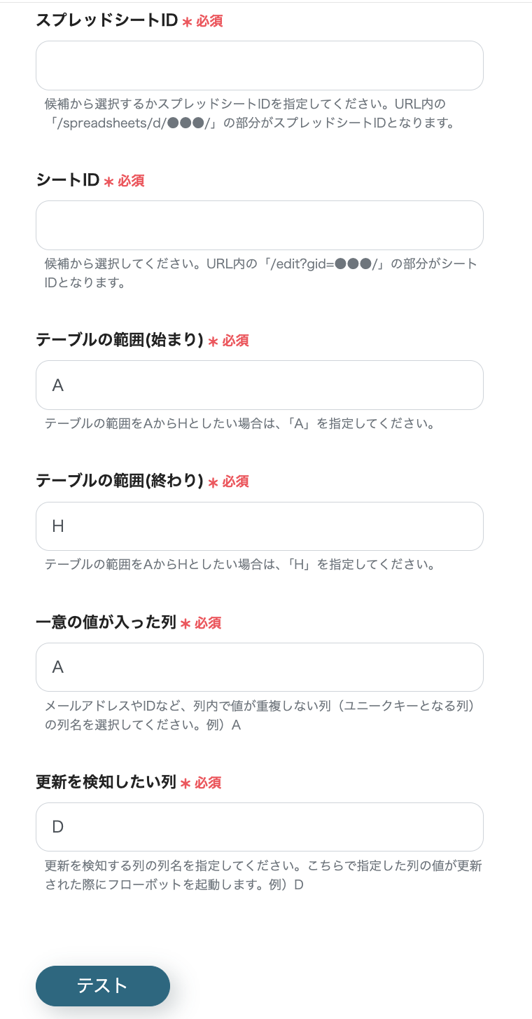 GMOサインとの連携設定では、ご利用の環境に応じたシークレットキーや顧客IDなどを任意で設定してください。 Google スプレッドシートでレコードを更新するアクションでは、更新対象としたいスプレッドシートのIDなどを任意で設定してください。 ■注意事項