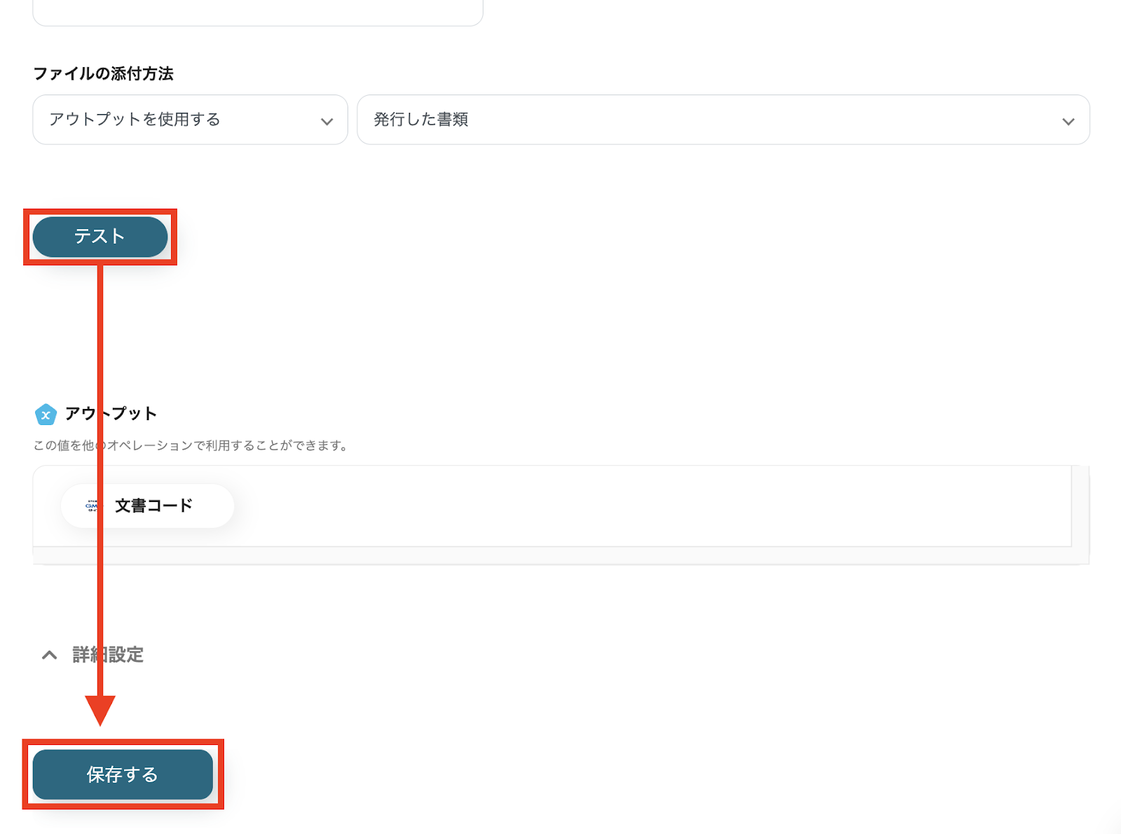 入力が完了したら「テスト」をクリックします。 アウトプットで「文書コード」が問題なく取得できているか確認し、「保存する」をクリックしてください。 これで、GMOサインの封筒用文書の登録は完了です。
