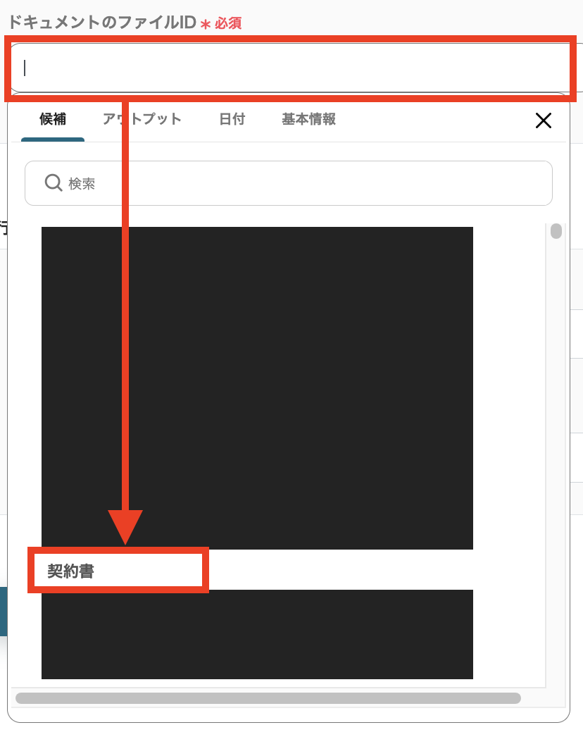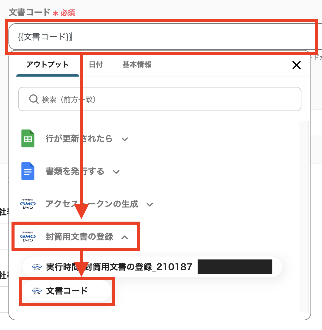 各欄をクリックすると、画面のように選択肢の中から値を設定することも可能です。 「文書コード」には、欄をクリックし、アウトプットからステップ7で取得した「文書コード」を選択してください。