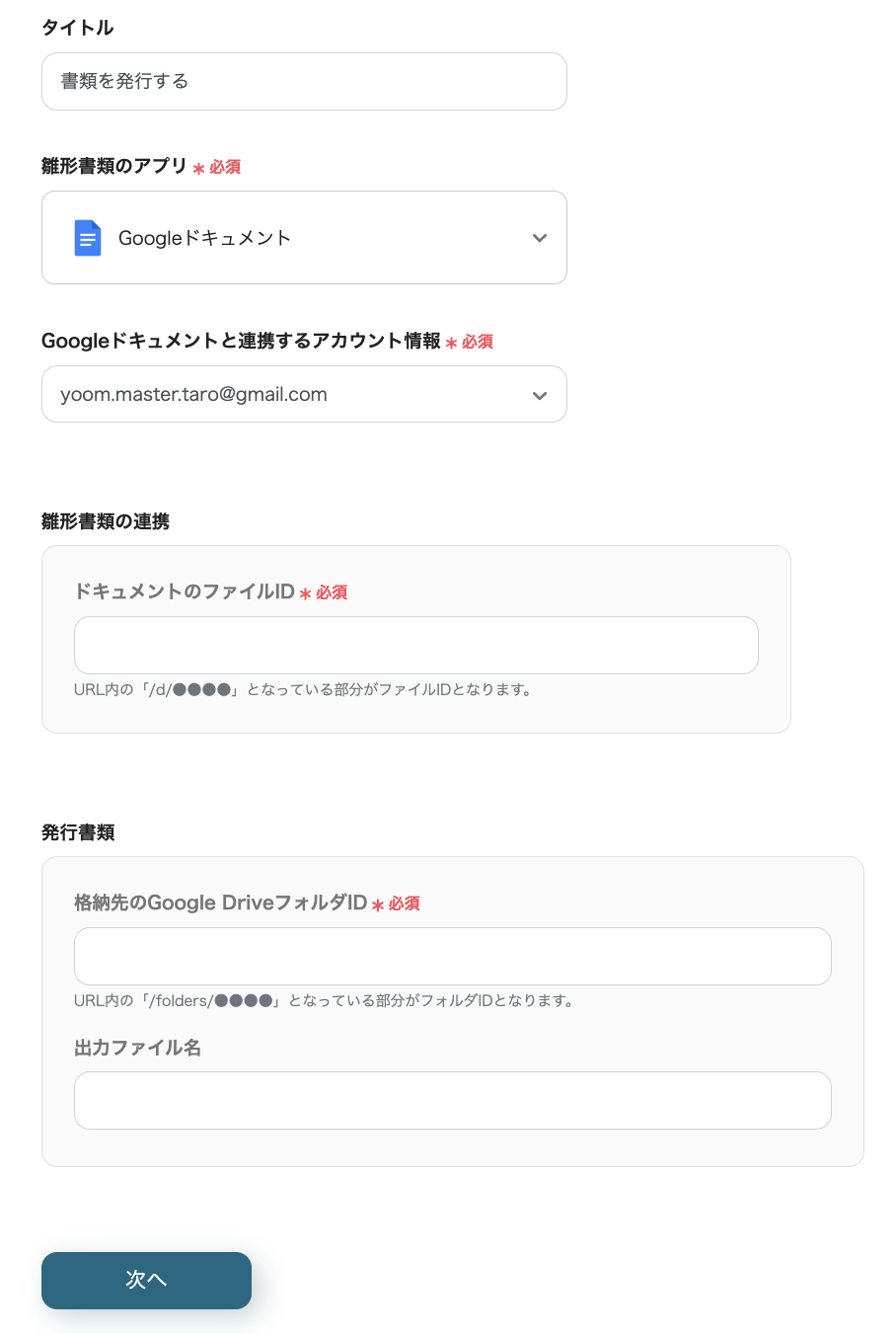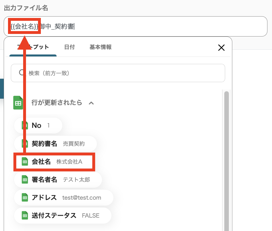 また、「出力ファイル名」の欄をクリックすると、ステップ3で連携したGoogle スプレッドシートの値を選択することもできます。 下記画面の「{{会社名}}」のように、Google スプレッドシートに入力した会社名をファイル名に設定することも可能です。取引先名をファイル名などに記載したい方はご活用ください。 入力が完了したら「次へ」をクリックします。