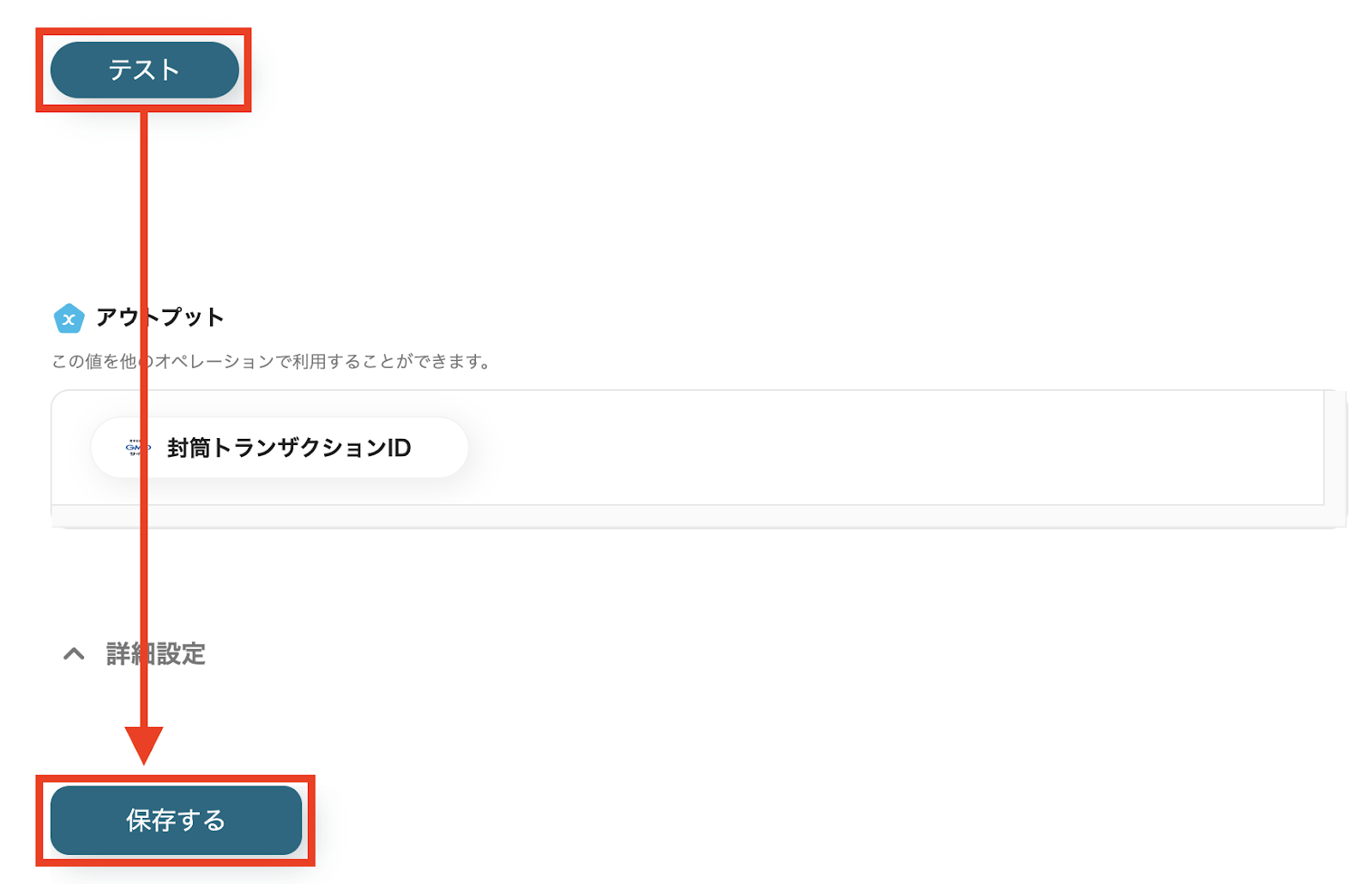 入力が完了したら「テスト」をクリックします。 アウトプットで「封筒トランザクションID」が問題なく取得できているか確認し、「保存する」をクリックしてください。 これで、GMOサインの封筒への署名依頼の登録は完了です。