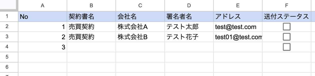 ステップ3:Google スプレッドシートのトリガー設定 ※設定前に、Googleスプレッドシートのトリガーにおける注意事項 を参照してください。 まず、Google スプレッドシートで作成した今回連携したいシートを準備しましょう。 本記事では次のシートを連携する想定で進めます。