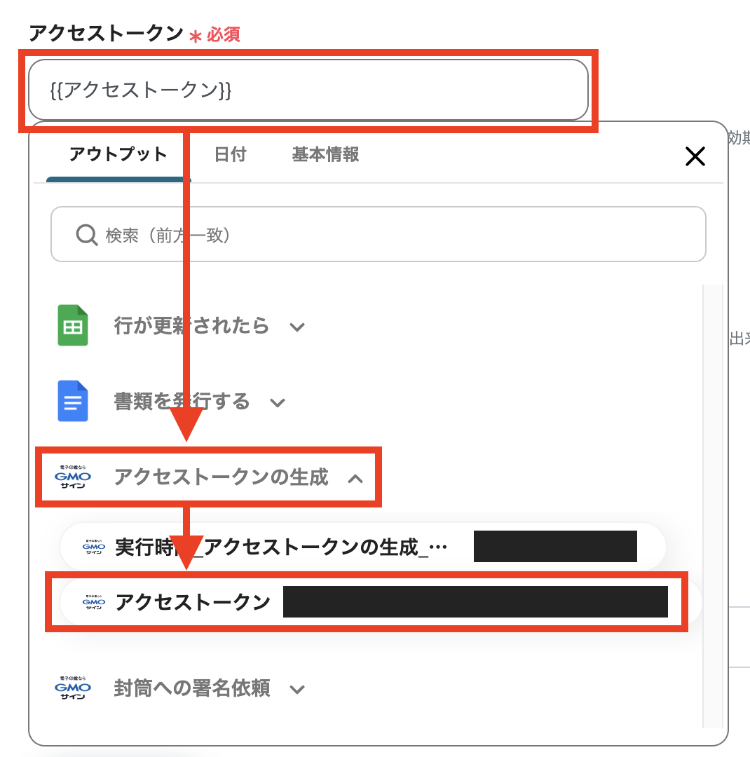 アクセストークン:ステップ5のオペレーションのアウトプットから選択