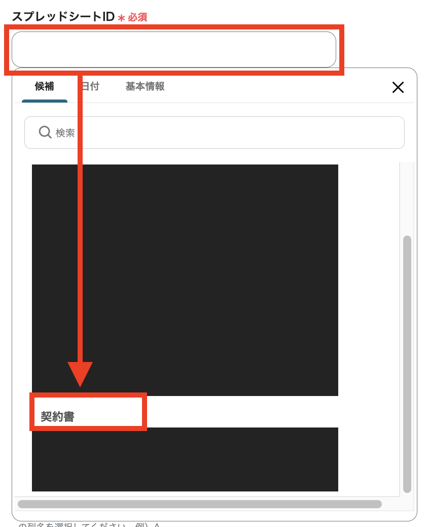 雛形書類中の{}で囲まれている文字列「置換対象の文字列」を取得し、上記画像の左列に自動で表示されます。 右列の空欄に、作成される契約書に記載する「置換後の文字列」を入力してください。 下記画像のように、各欄をクリックすると、ステップ3で連携したGoogle スプレッドシートの値を選択することもできます。
