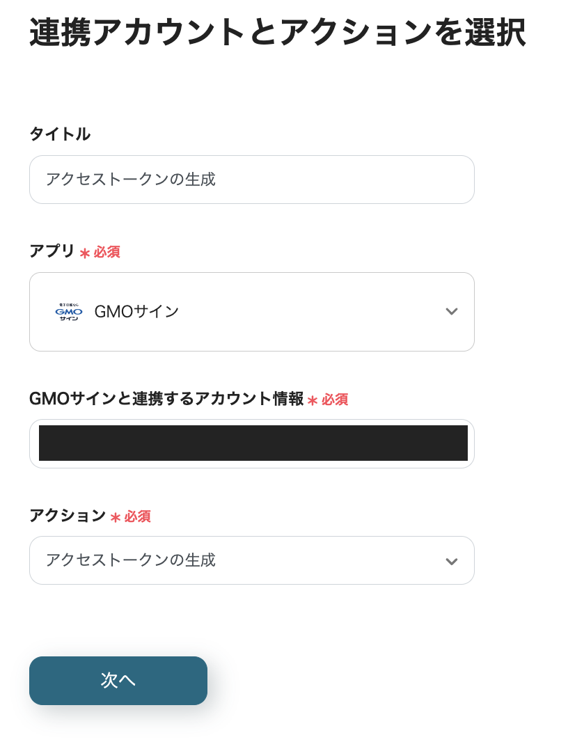 下記画面が表示されたら、GMOサインと連携するアカウント情報を確認して「次へ」をクリックします。