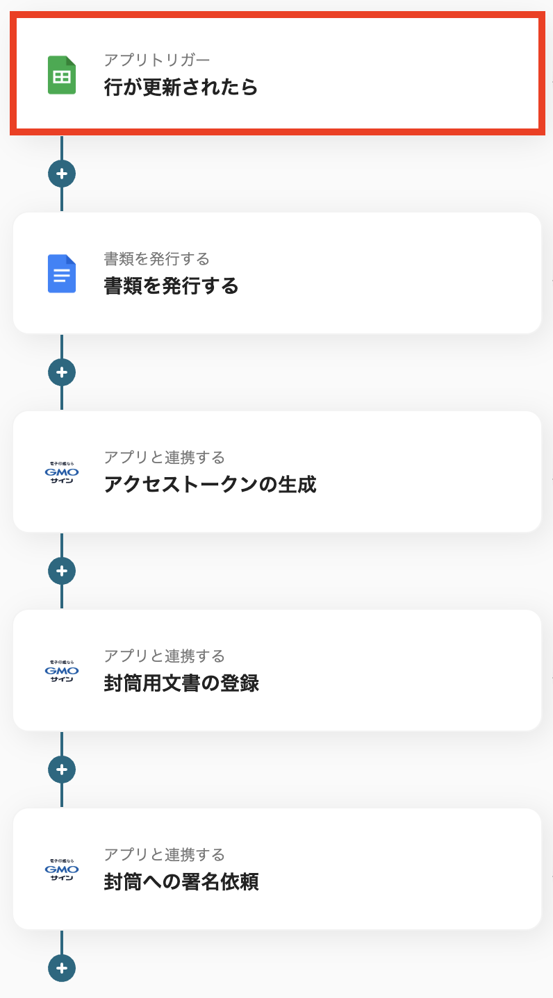 フローの作成方法 今回はGoogle スプレッドシートでステータスが更新されたら、GMOサインで契約書を送付するフローを作成していきます! 作成の流れは大きく分けて以下です。