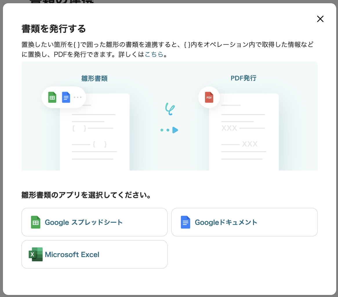 「雛形書類のアプリ」は、Google スプレッドシート、Google ドキュメント、Microsoft Excelから選択できます。 置換したい箇所を{ }で囲った雛形の書類を連携すると、{ }内をオペレーション内で取得した情報などに置換し、PDFを発行できます。 ※雛形書類の作成ルール、設定方法、サンプルなど、詳細は「書類を発行する」の設定方法 をご覧ください。