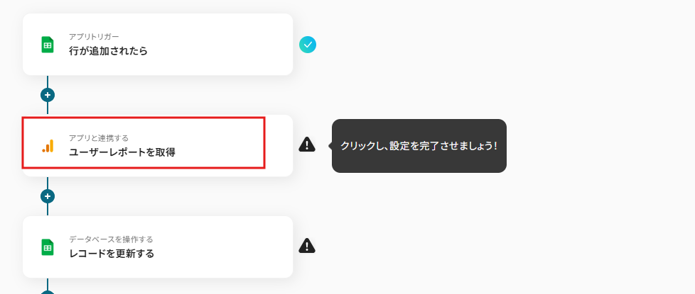 Yoomを利用することで、ノーコードで簡単にGoogle スプレッドシートで行が追加され、Google アナリティクスから最新のユーザーレポートを取得する連携が可能です。