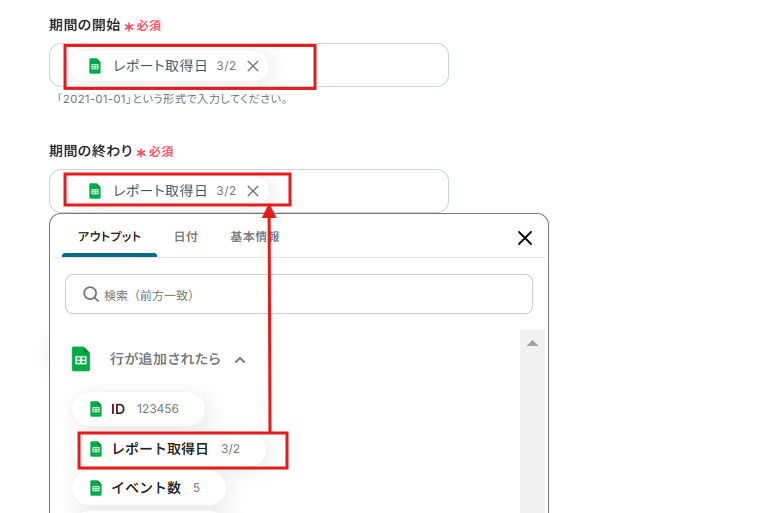 「期日の開始」と「期日の終わり」は以下のように、レポートを取得したい日を選択して挿入しましょう。