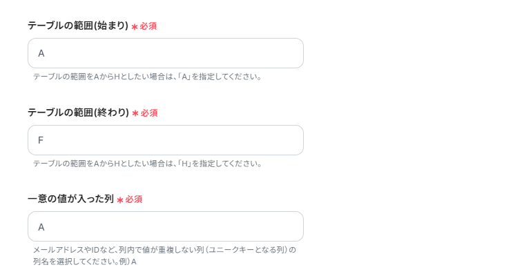「一意の値が入った列」は、入力欄の注意点を確認して設定しましょう。
