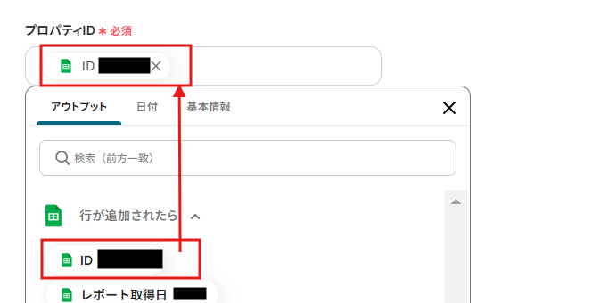 「プロパティID」、「期日の開始」、「期日の終わり」をアウトプットから選択していきます。