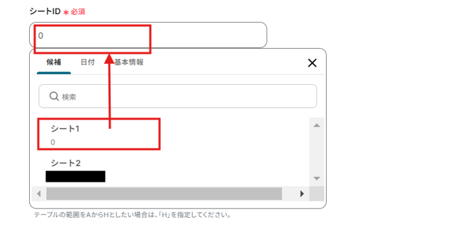 「スプレッドシートID」は候補から選択してください。 対象のスプレッドシートを指定しましょう。